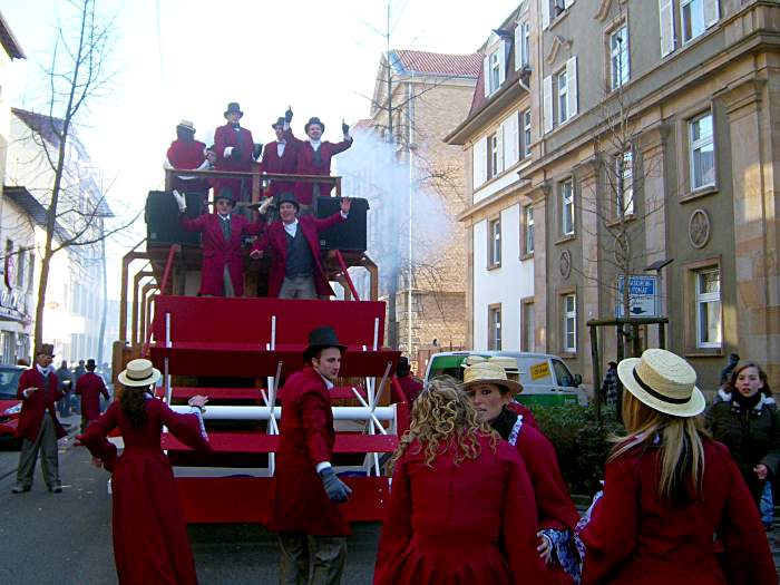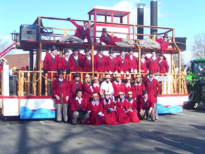 Samstag, 2. Februar 2008Helau!Die Landjugend Insheim ist dieses Jahr wieder auf großer Fahrt - diesmal mit einem Schaufelraddampfer (fast) in Originalgröße. Das heißt: Breite 3 m, Höhe mit Schornsteinen und Führerhaus geschätzt 6 m (sonst straßentaugliche 4 m), Gesamtlänge incl. Traktor geschätzt 18 m. Die Schornsteine sind übrigens so hoch, dass wir sie an jeder Ampel umklappen müssen ;-) Los ging unsere Faschingstour heute beim Faschingsumzug in Landau: Die Faschingstour geht weiter: