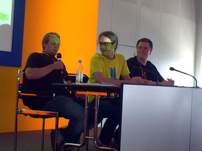 Only 5 persons came to my openSUSE jeopardy, but they all played and had fun in finding the matching questions for my answers about Linux and openSUSE. Jan must have had most fun - he won both rounds (and two bottles of wine). The IRC based "buzzer" worked quite well and will probably be used again at next LinuxTag. On monday, I was one of the few participants of the BoF about the openSUSE landing page, which we extended time-wise. This also means the admin@ BoF was more or less dropped, which wasn't really bad because there weren't admins around. Afterwards, Coolo volunteered me ;-) to operate a video camera. The terrible pictures of the audience on monday afternoon (project meeting etc.) and tuesday (mostly room Riker) are from me ;-) Thanks to everybody who contributed to the openSUSE Conference, and for the travel support! Slides: Freitag, 11. Juni 2010