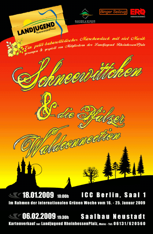 Alles begann damit, dass ein paar Landjugendliche aus Rheinhessen und der Pfalz eine Idee hatten: Die Idee nämlich, die Themen, die Jugendliche auf dem Land, Jungwinzer und Junglandwirte bewegen, als Theaterstück auf die Bühne zu bringen. Das ist für Landjugendliche aus der Region nichts ungewöhnliches: Schon 1999 spielten Rheinhessen "Jenseits von Frettenheim" im Rahmen der Jugendveranstaltung des Bundes der Deutschen Landjugend (BDL) in Berlin; und bereits in den 70er und 80er Jahren sei die Landjugend bereits mit Theaterproduktionen positiv aufgefallen, berichtet Harald Krummenauer, ehemals Bundesgeschäftsführer des BDL und Zuschauer bei der Uraufführung. Nachdem die Idee Konturen gewann, wurde es Ernst: Bewerbung bei der Bundesmitgliederversammlung um den Zuschlag für das Theaterprojekt, Suche nach geeigneter theaterpädagogischer Unterstützung, Aufstellen eines Finanzierungsplans, Werbung in den Landjugendgruppen, Zusammenstellung der Schauspielercrew und des "technischen Personals" für Licht, Ton und Spezialeffekte. Im April vergangenen Jahres trafen sich knapp 20 Landjugendliche zum ersten Mal zu einem Probenwochenende. Und hatte manch einer vorher vielleicht gedacht, dass ein bereits vorliegendes Stück produziert würde, so sah er sich spätestens dann gründlich getäuscht: Alle Schauspieler entwickelten die Inhalte, Szenen und Abläufe im Laufe der ersten 3 Probenwochenenden selbst; aus den szenischen Elementen fertigte die engagierte Theaterpädagogin dann das gesamte Stück, das über die Sommerzeit eingeübt werden musste und dann mit Start in den Herbst 2008 geprobt wurde. Aufgrund der riesigen Ausmaße der Bühne in Berlin waren besondere Anforderungen zu erfüllen: Mit 24 m Breite stellte die Bühne des Großen Saales eine gewaltige Herausforderung für die Kulissenbauer dar. Mit Hilfe von Landjugendgruppen aus Zweibrücken, Monzernheim und Guntersblum wurde gezimmert und gesägt, gemalt und gemessen. Zusätzliche Schwierigkeiten ergaben sich aus der Tatsache, dass alle Materialien feuerhemmenden Anforderungen genügen mussten. So entstanden im Laufe der Wochen ein Hexenhaus, ein Rapunzelturm, ein Zwergenhaus, Thron und Spiegel, Bäume und Sträucher - alles zerlegbar, damit der Transport nach Berlin bewältigt werden konnte. Mit Hilfe der Theatermaler des Staatstheaters Darmstadt entstanden die 8x6 m großen Prospekte für den Hintergrund mit Waldszene, Weinberg und Königschloß. Aber nicht nur das: Das Stück sieht Videoeinspielungen vor - also mussten Filmsequenzen gedreht, geschnitten, nachvertont werden - eine zeitraubende und diffizile Arbeit, für die manche Nachtstunde draufgegangen ist. Zwischen den Jahren wurde alles mit dem letzten Feinschliff versehen, und am zweiten Januarwochenende fand die letzte Vorabprobe mit den Kulissen in der Heimat statt. Danach hieß es: Alles transportsicher auf den LKW verladen, die Requisitenliste ein letztes Mal gegenchecken und - ab nach Berlin. Nach einer langen Fahrt durch die Nacht im Bus bestand die erste Aufgabe in Berlin darin, gemeinsam mit den Technikern des ICC das Bühnenbild aufzubauen und einzurichten. Der Aufbau der Kulissen benötigte fast einen ganzen Tag; danach mussten Mikrophone eingestellt, das Licht angepasst und die Laufwege erprobt werden. Sichtlich geschlaucht spielte die Theatercrew am Ende des Aufbautages erste Durchläufe. Wunderbarerweise fügte sich eines zum anderen, und die ganze Produktion nahm so langsam die endgültige Form an. Am nächsten Morgen wurden die Proben fortgesetzt, letzte Änderungen an den Kulissen vorgenommen und zwei Generalproben gespielt. Und wie das bei Generalproben so ist: Es hakte noch an einigen Stellen, Unklarheiten mussten beseitigt, letzte Absprachen getroffen werden. Dafür wurde die Uraufführung vor den 1800 Zuschauern ein voller Erfolg. Mit Hingabe und Begeisterung spielte die Landjugend RheinhessenPfalz ihr Stück, und diese Motivation sprang in den Saal über. Ach ja, und das Stück? Das handelt von Schneewittchen, der Tochter von König Kurt und Königin Angela, das doch etwas schlauer ist als ihr Papa; dieser möchte sich von seiner Tochter nicht länger bevormunden lassen und plant, sie umzubringen. Zur Hilfe kommen sollen ihm dabei Spiegel und Zauberer - allerdings gelingt der Mordkomplott nicht. Und Schneewittchen kümmert sich derzeit um das heruntergekommene Weingut der sieben Zwerge, bringt es auf Vordermann und findet am Ende noch den Prinzen, der sie heiratet. "Die Themen, die wir in unserem Stück verarbeitet haben, sind sehr vielfältig", kommentiert Peter Geil, ebenfalls für die Produktion verantwortlich, die Inhalte: "Willst Du lieber auf dem Land oder in der Stadt wohnen? Ernährst Du Dich gesund oder eher nicht? Engagierst Du Dich oder lässt Du andere machen? Du hast die Chance der Wahl - nutze sie" faßt Geil die wesentlichen Aussagen zusammen. Über 30 hochzufriedene Schauspieler und Techniker, Bühnenbauer und Helfer feierten ihren Erfolg in Berlin und genossen nach der Aufführung noch die vielfältigen Angebote der Grünen Woche und der Stadt. Und um auf den Anfang dieses Berichtes zurück zu kommen: Für die Aufführung am 6.2. im Neustadter Saalbau muss vieles neu gedacht und umgebaut werden; die Bühnenmaße sind anders, man kann die Szenen nicht parallel aufbauen, die Wege sind kürzer. "Kein Problem, das kriegen wir auch noch hin" kommentiert Bühnenbauer Alexander Siegmund. Und die Saalbautechniker ermutigen die Crew: "Ihr werdet das wunderbar machen". Wovon wir ausgehen. Lust bekommen?Wer noch mit dabei sein will: Rund 800 Karten sind bereits verkauft; ein letzter Rest ist noch bei mir oder direkt bei der Geschäftsstelle der Landjugend in Mainz zu haben (Tel. 06131/620560). Ganz Kurzentschlossene können ihr Glück auch an der Abendkasse versuchen. Der Saalbau öffnet am nächsten Freitag, 06.02. um 19:00 Uhr seine Türen, der Vorhang öffnet sich um 19:30 Uhr. Freitag, 26. Dezember 2008Schneewittchen & die Pfälzer Waldc